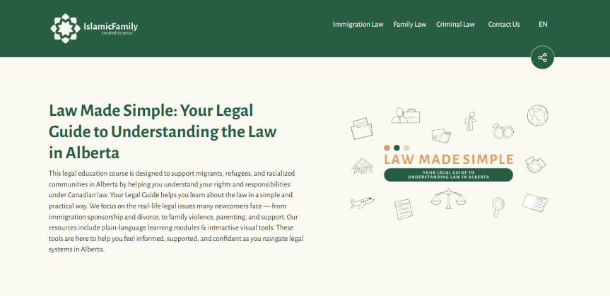 This project is a comprehensive legal guide developed by IslamicFamily to support refugees, immigrants, and racialized communities in Alberta. It aims to help newcomers understand their rights and responsibilities under Canadian law, addressing key topics such as immigration sponsorship, divorce, family violence, parenting, and support.